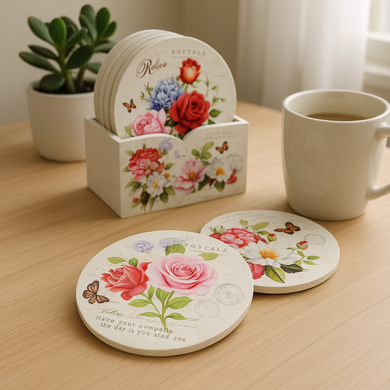 ☕ Vintage Floral Wooden Coaster Set (6 pcs with Holder)