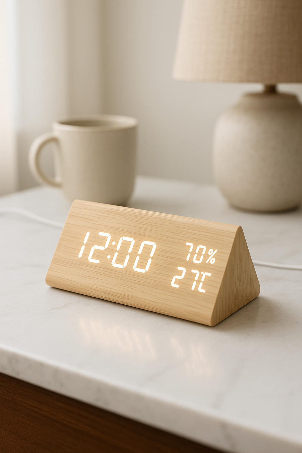 A sleek, triangular digital clock crafted with a natural wood finish — blending technology with timeless design. The glowing amber digits float softly across the grain, creating a calm, elegant vibe for your bedside or office desk.